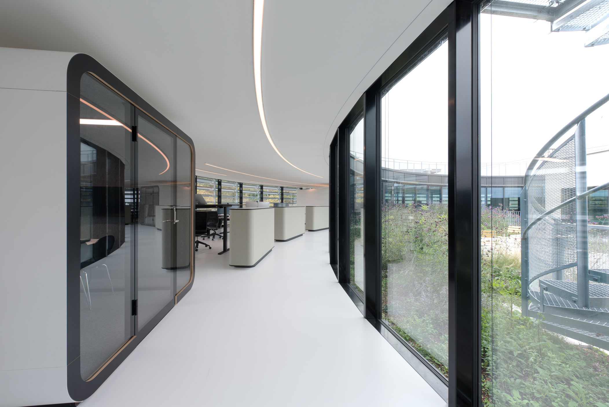 Die Architektur mit rundumlaufenden Fensterfronten und kreisförmigen Deckenabschlüssen verlangte präzise Lösungen, die in Zusammenarbeit mit Rigips entwickelt wurden – von sauber gerundeten Abschlüssen bis zu passgenauen Einbauten für Lichtbänder und Vorhangschienen.