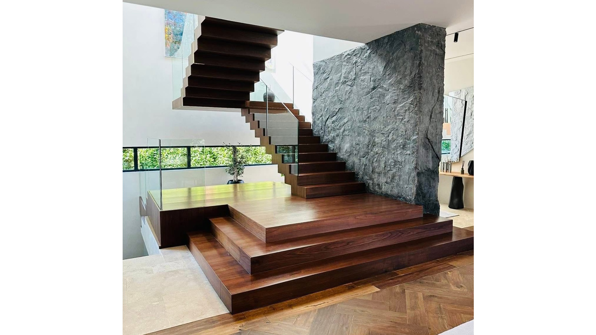 Eine einzigartige Treppe aus Massivholz mit Glasgeländer wirkt, als schwebe sie im Raum, und wird zum Mittelpunkt des Interieurs. Ihre skulpturale Form verkörpert die Größe moderner Eleganz im Innendesign.