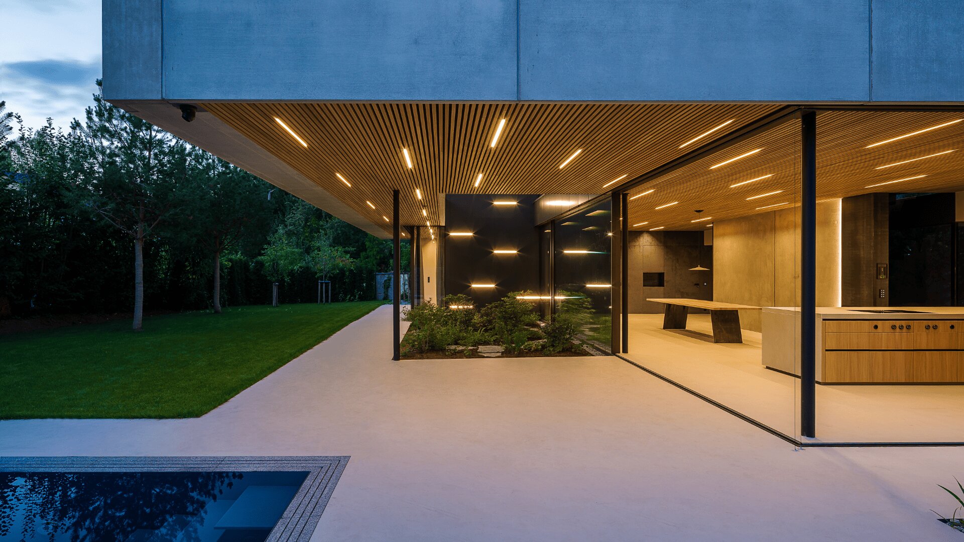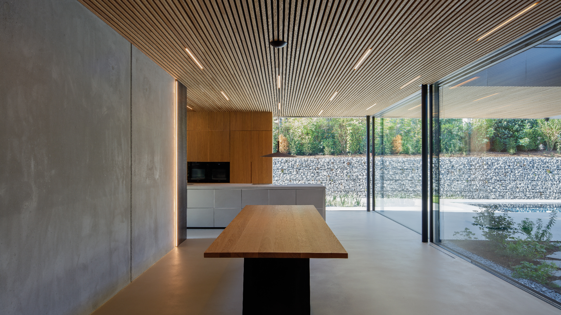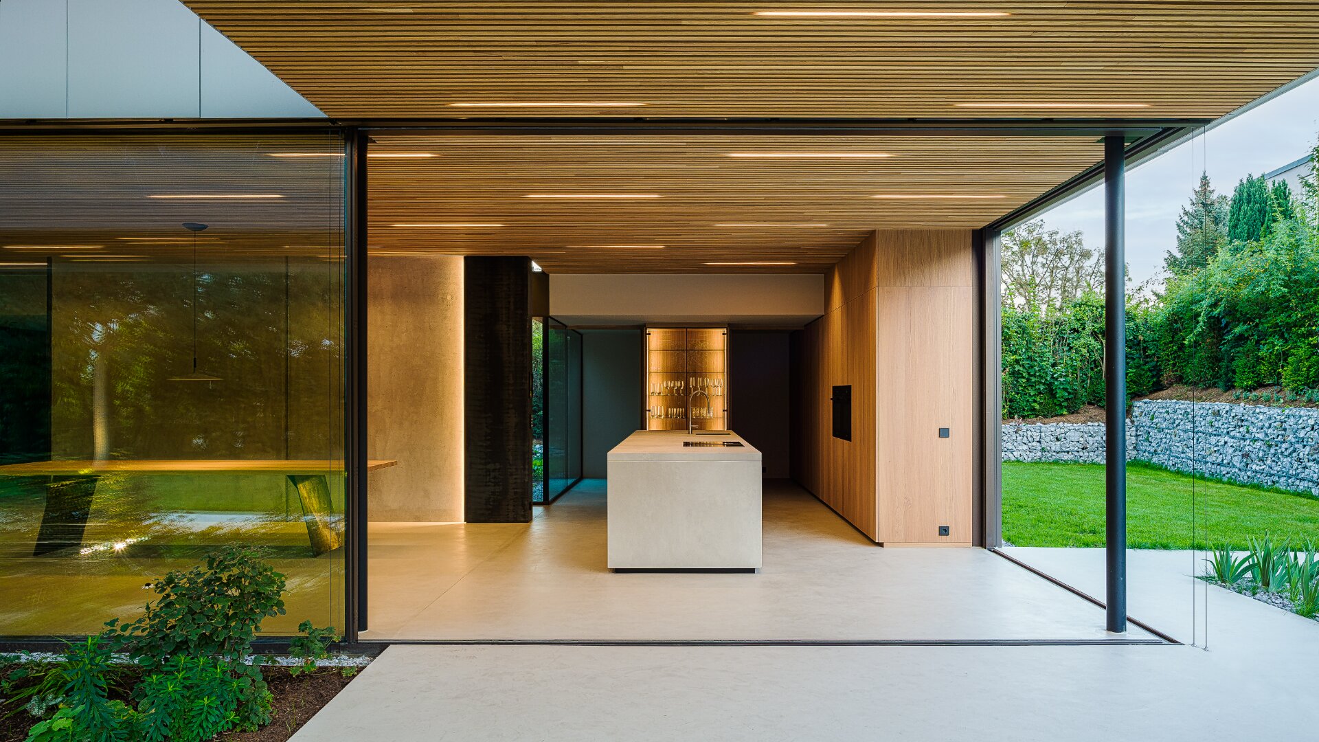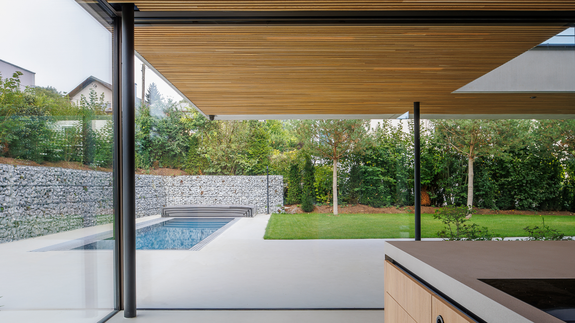 Die klaren Linien und das Zusammenspiel der Baumaterialien prägen das Innendesign im Haus. Um eine warme und wohnliche Atmosphäre zu schaffen, wurden diverse Holzelemente eingesetzt. Mit der Küche in Betonoptik und dem Spachtelboden erhält der Wohnbereich einen individuellen Charakter. Die rahmenlosen Schiebefenster reihen sich in Perfektion ein. Die grossflächigen Glaselemente fangen das Maximum an Tageslicht ein und bringen das Interieur im natürlichen Licht zum Strahlen. Mit den schmalen Aluminiumfassungen, die in der Decke und den schwellenlosen Laufschienen im Boden verschwinden, gelingt mit swissFineLine eine einzigartige Optik fliessender Übergänge und damit eine neue Definition von Barrierefreiheit. Die Weitläufigkeit des Wohnbereichs scheint sich nahtlos mit dem eindrucksvollen Garten mit Pool zu verbinden: Mit unverwechselbarer Schlichtheit lassen die rahmenlosen Fensterelemente von swissFineLine das Innen mit dem Aussen verschmelzen.