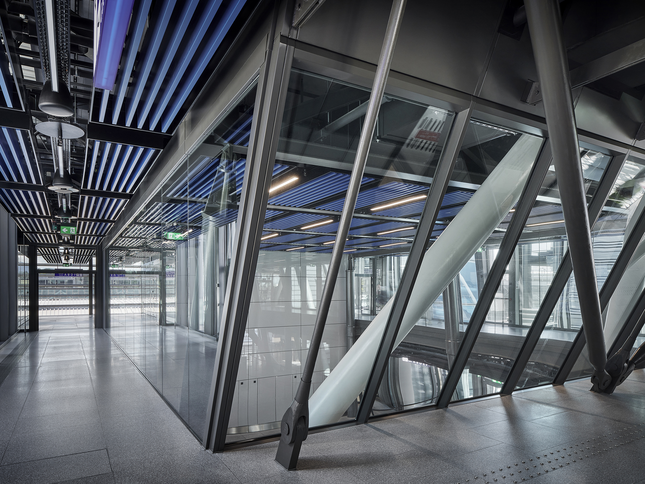 Durch die Konstruktion in Form eines Exoskeletts, also einer Tragstruktur ausserhalb des Gebäudes, konnten die Innenräume flexibel und luftig gestaltet werden. Glaswände, die der Lenkung der Personenströme dienen, sorgen für viel Tageslicht im Gebäudeinneren und erleichtern die Orientierung. Auch die Brüstungen der Rollsteige und zahleiche Türen sind aus Glas und unterstützen den offenen, heiteren Charakter der Architektur. Die bis zu vier Meter hohen Verglasungen im Gebäudeinnern sind ein wesentliches Element der Innenraumqualität, die trotz des schmalen Baukörpers durch Grosszügigkeit und spannende Sichtbezüge besticht. Für die Glasflächen und die bei Grossprojekten dieser Art erforderlichen Brandschutzabschottungen kam das Profilsystem forster fuego light zum Einsatz. Es ermöglicht die Ausführung von Festverglasungen mit integrierten Schiebetüren, die im Brandfall die horizontalen und vertikalen Fluchtwege gemäss der Brandschutzrichtlinien der AEAI (Association des établissements cantonaux d’assurance incendie) gewährleisten.