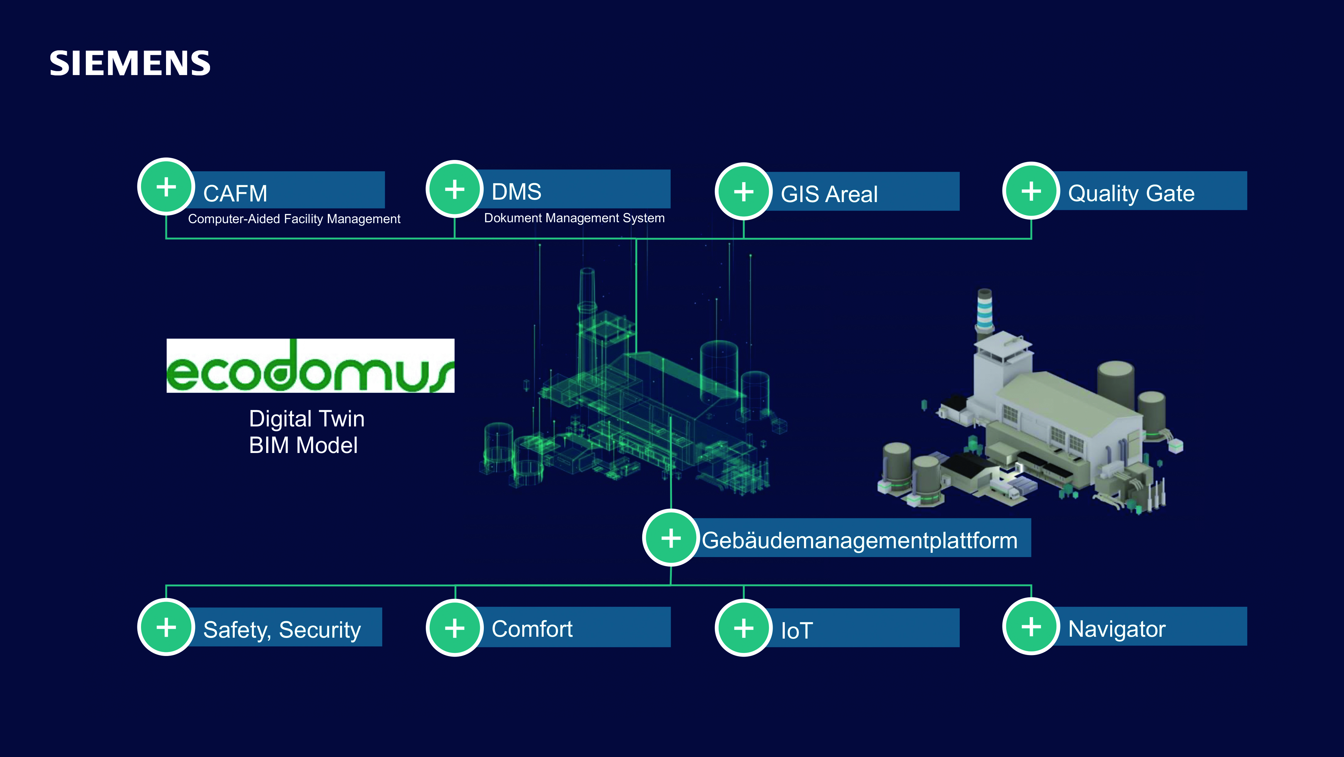 In der Betriebsphase fallen 80% der Gesamtkosten eines Gebäudes an. Siemens begegnet dieser Herausforderung mit Ecodomus, einer offenen webbasierten Plattform, die das klassische Computer Aided Facility Management (CAFM) mit einem plattformübergreifenden Common Data Environment (CDE) erweitert. Individuelle Anwendungsfälle ermöglichen dem Facility Management ein innovatives Arbeitsumfeld. In Ecodomus können die BIM Modelle aus der Planung, die Live-Daten aus der Desigo CC Gebäudemanagement-Plattform (BMS), die Arbeitsaufträge und Wartungsinformationen aus dem computergestützten Wartungsmanagement-System (CMMS) und die dynamischen Daten über IoT integriert und bewirtschaftet werden und dabei gleichzeitig Arbeitsweisen verbessert sowie Betriebskosten gesenkt.
