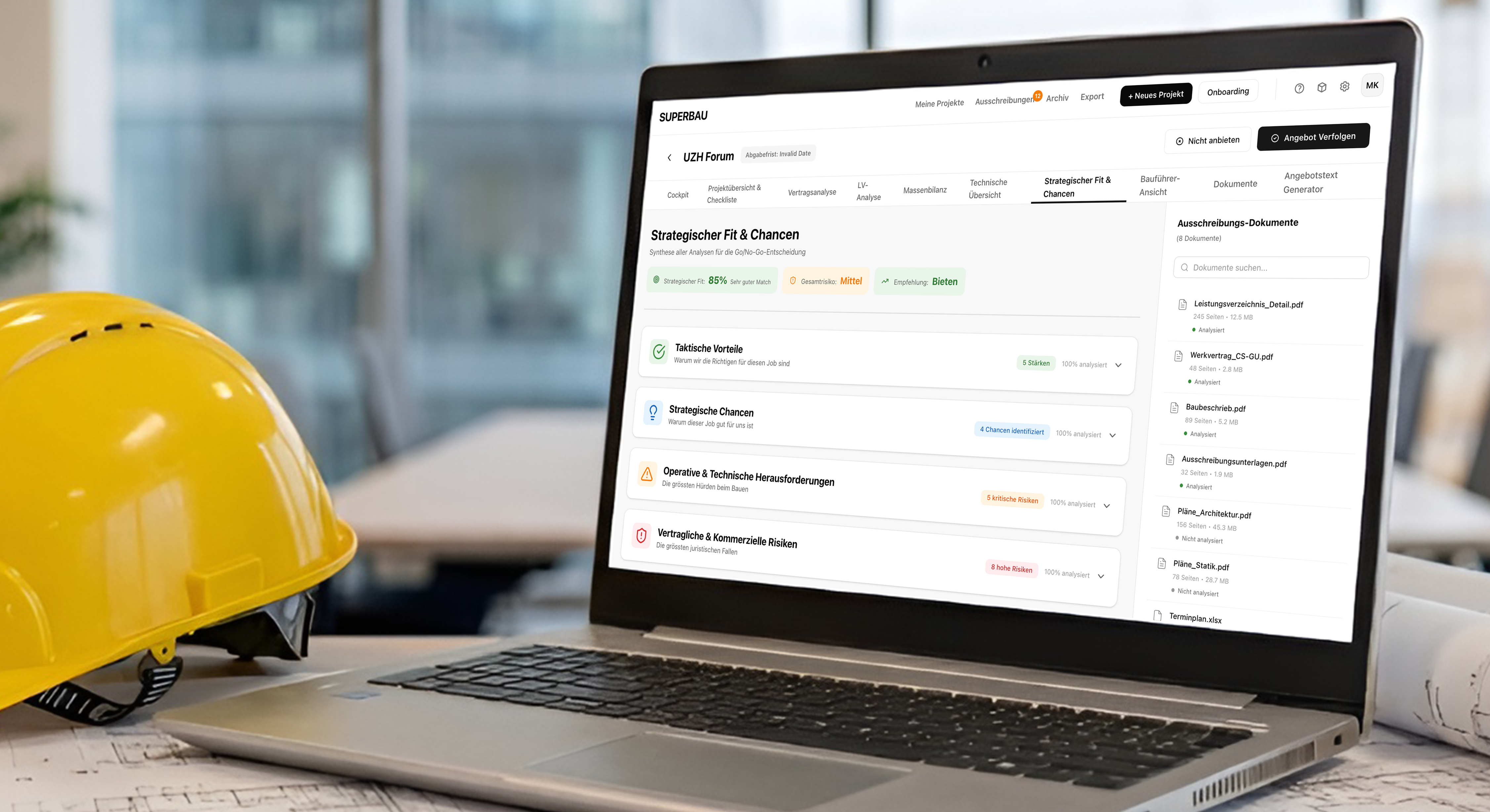 Die manuelle Prüfung von Ausschreibungen ist zeitaufwendig. Wir zeigen, wie Sie diesen Prozess mithilfe von Superbau erheblich verkürzen können. Superbau nutzt KI, um Ausschreibungsunterlagen zu analysieren und fertige Submissionsunterlagen zu erstellen, für mehr Sicherheit und Effizienz.