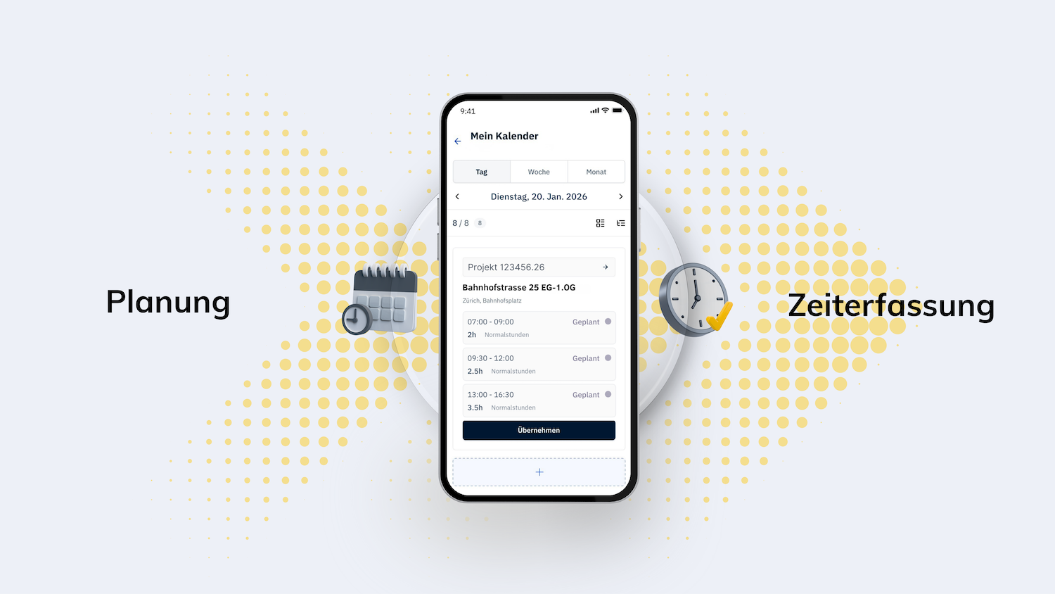 Wir zeigen, wie Einsatz- und Ressourcenplanung direkt als Basis der Zeiterfassung dient: Einsätze planen, Kapazitäten steuern, Zeiten in die Rapportierung übernehmen und visieren. So sinkt der Aufwand, Fehler nehmen ab, die Effizienz steigt.
