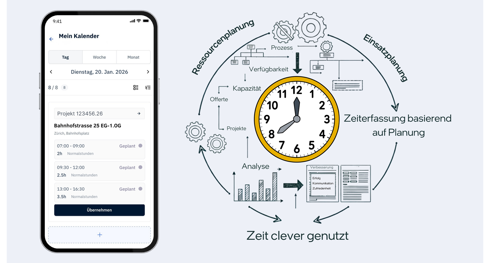 Wir zeigen, wie Einsatz- und Ressourcenplanung direkt als Basis der Zeiterfassung dient: Einsätze planen, Kapazitäten steuern, Zeiten in die Rapportierung übernehmen und visieren. So sinkt der Aufwand, Fehler nehmen ab, die Effizienz steigt.