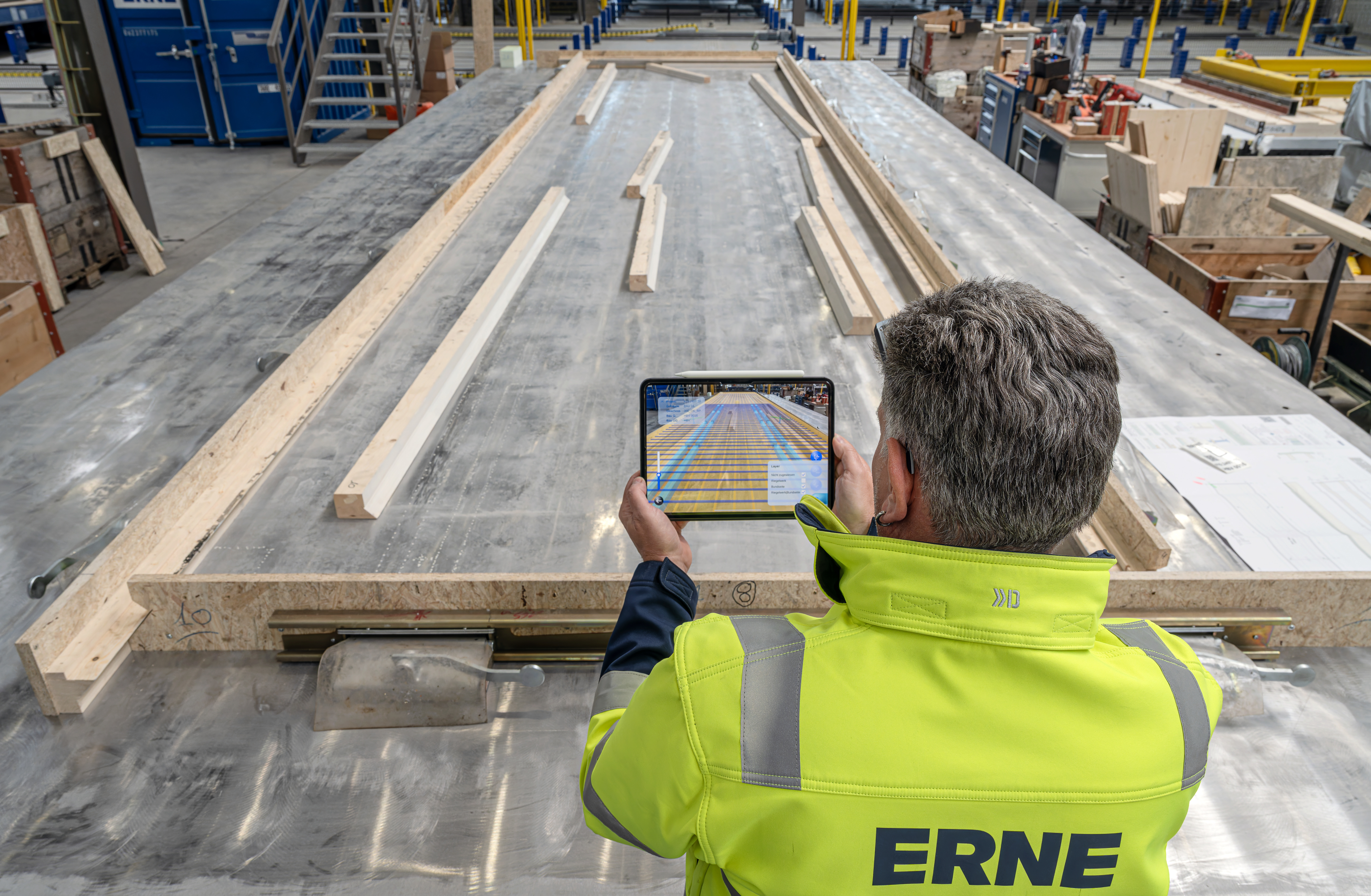 ERNE zeigt in der Werkstatt den Produktionsablauf im Holz-Hybridbau – vom IFC-Layout über Einschalen, Bewehrung und Einbauten bis zur „Hochzeit“ von Holz und Beton. Erleben Sie live, wie digitale Prüfungen mit der AR-App funktionieren und Fehler sofort sichtbar werden.