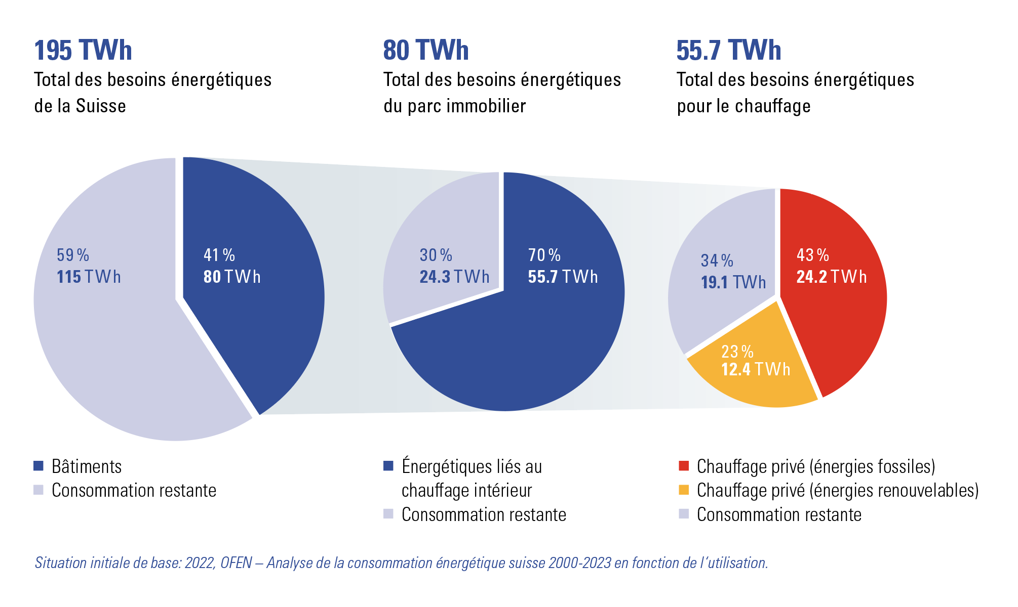 Dans un but de simplification, l’étude suppose que tous les chauffages au mazout, au gaz et à l’électricité sont remplacés par des pompes à chaleur. La consommation d’électricité ainsi atteinte est de 11,5 TWh. En isolant en plus les enveloppes des bâtiments, cette consommation baisse à 6,2 TWh, soit 5,3 TWh de moins. Cette réduction représente environ 10 % de la consommation électrique suisse ou la consommation électrique annuelle des cantons de Saint-Gall et des Grisons. Les bâtiments résidentiels ne constituant que les deux tiers du parc immobilier, le potentiel d’économies est globalement encore plus élevé.