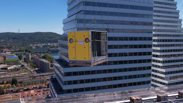 Une installation de ventilation de cette taille représente un grand défi pour la logistique. Dès la planification, les dimensions des appareils doivent être adaptées aux moyens de transport possibles. Grâce à la construction en modules, le prémontage est possible dans l'usine de production. Cela permet d'augmenter l'assurance qualité et d'assurer un montage efficace. Lors du chargement, il faut tenir compte de la situation sur le chantier. Si le "mauvais" sous-ensemble est livré au "mauvais" moment, il en résulte un surcroît de travail considérable. Le plus grand défi est alors la mise en place sur le chantier. Dans le cas du bâtiment 7, il s'agissait entre autres de hisser les appareils dans la centrale de ventilation au 24ᵉ étage. En raison de la hauteur de la grue et des bâtiments déjà construits, le grutier n'a pas de vue sur les appareils au sol. Il navigue avec l'image de la caméra. Le personnel au sol est chargé de la sécurité et de l'assistance. Un véritable travail d'équipe.