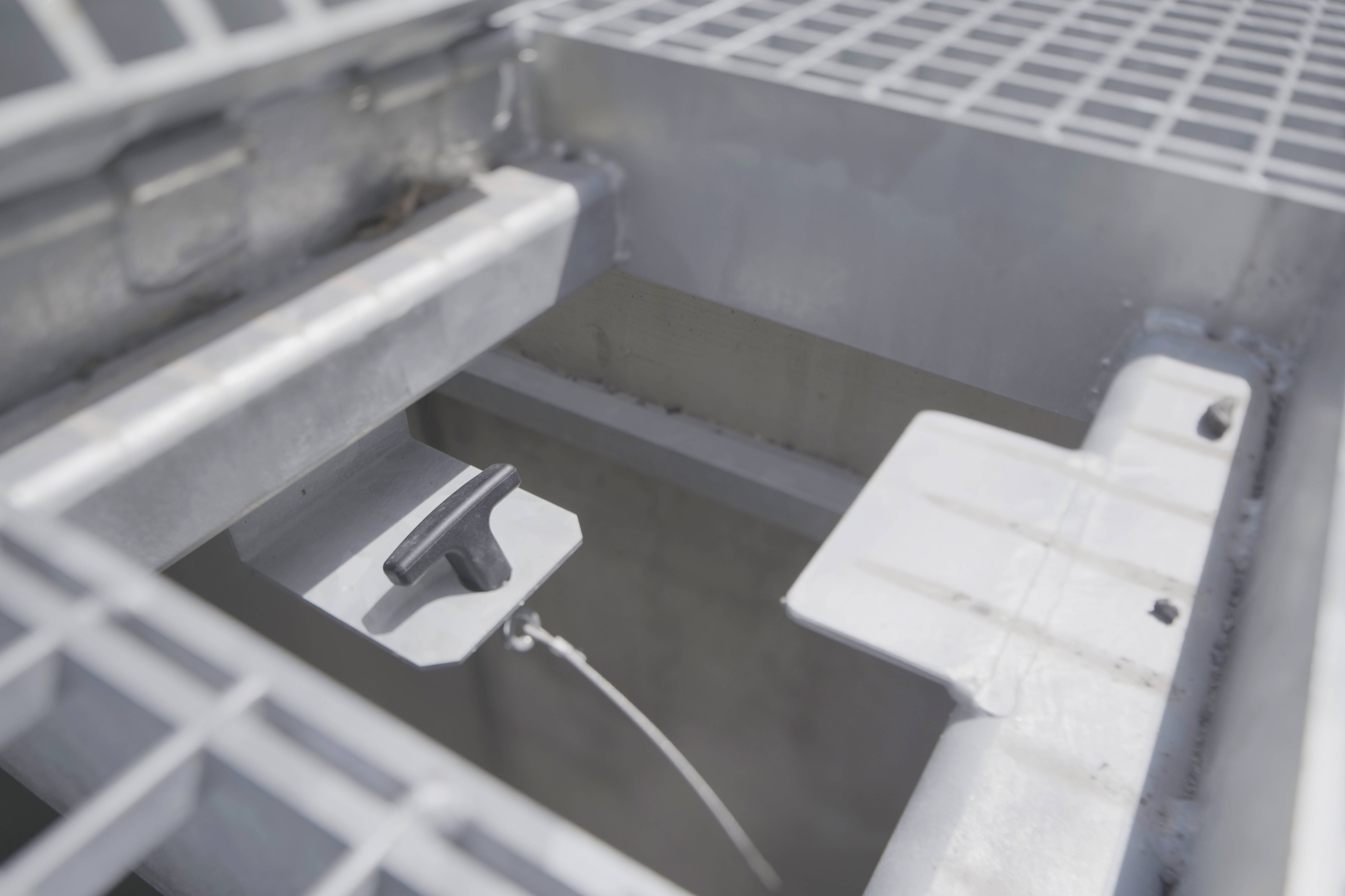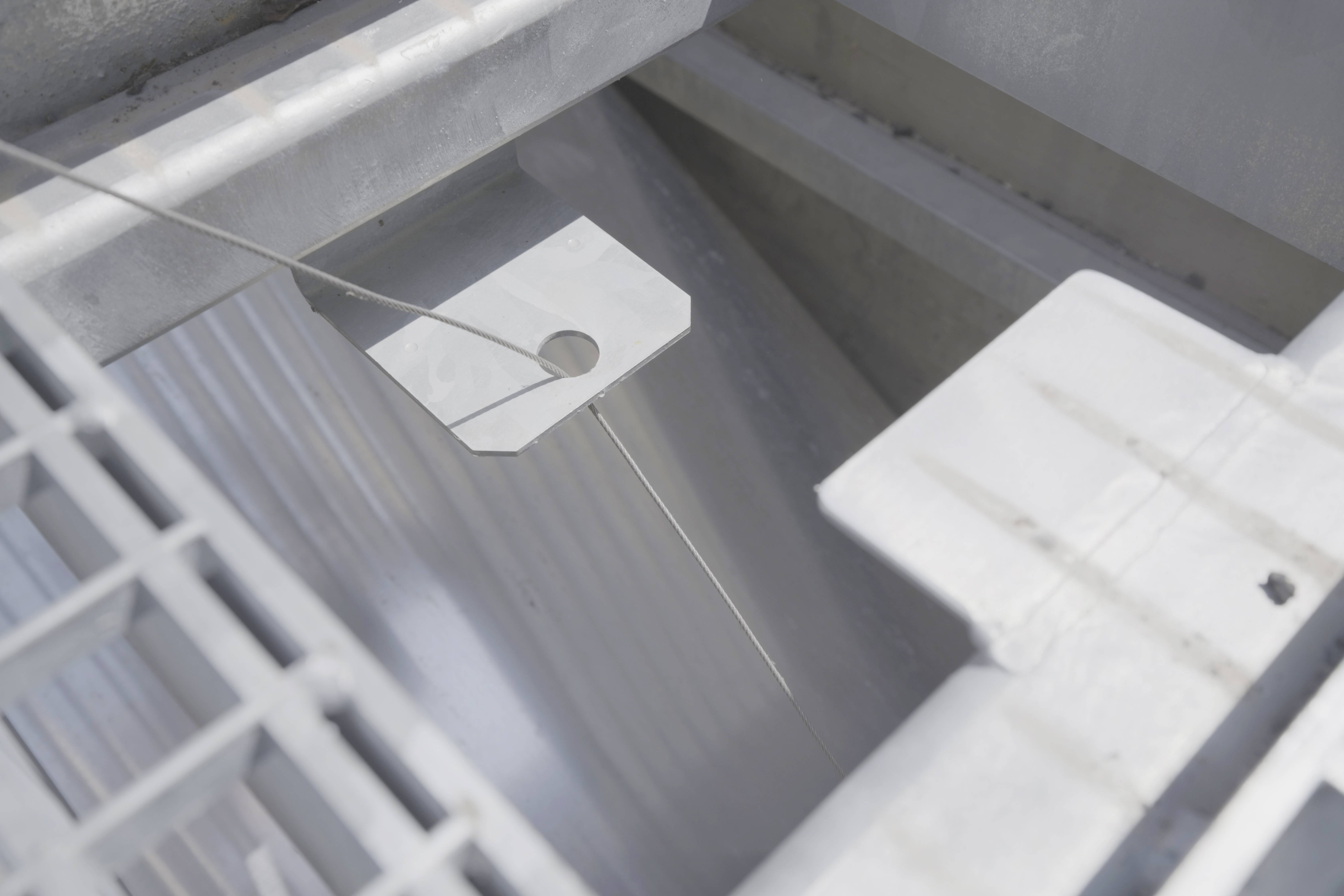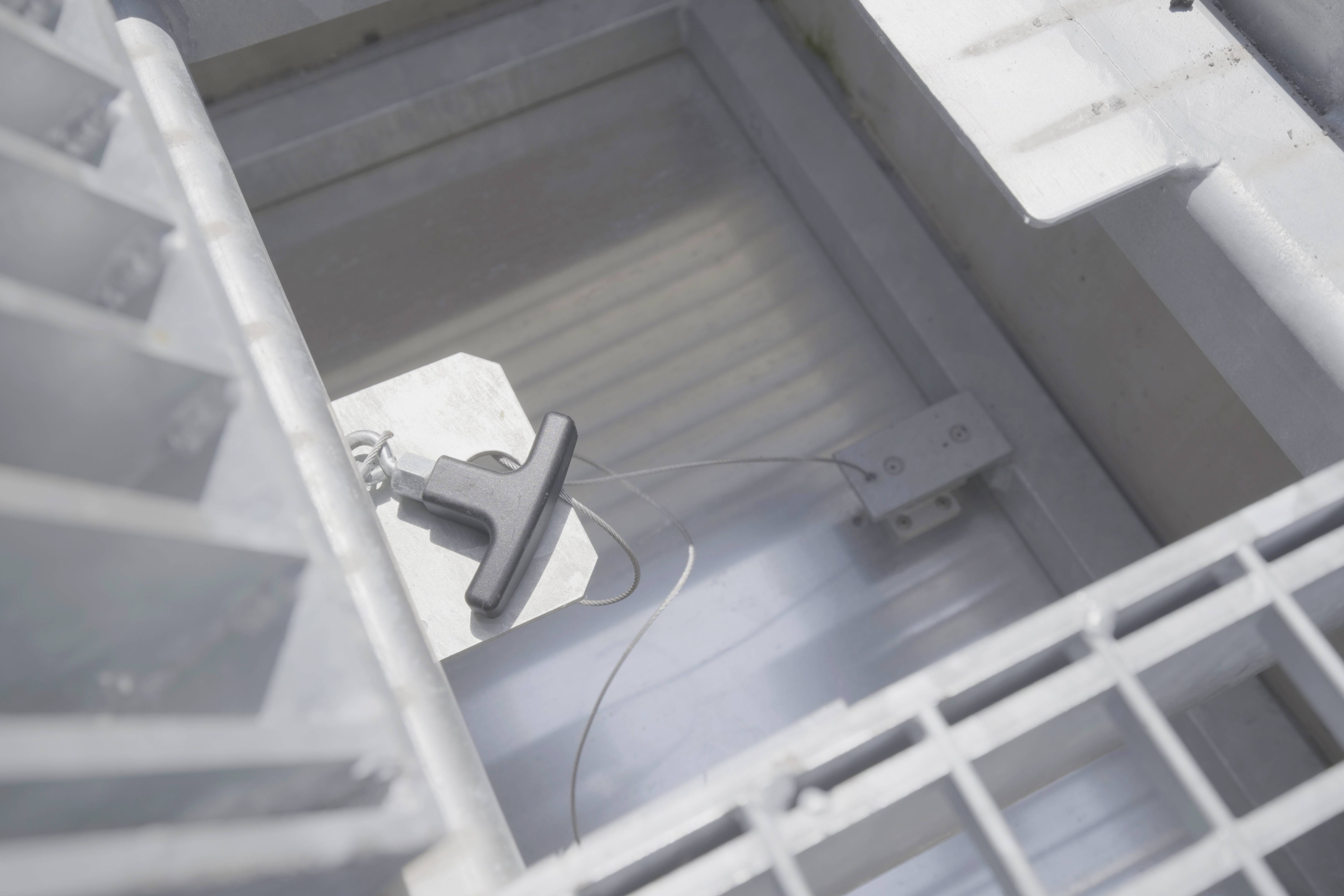 Les volets de fumée évacuent de manière ciblée la fumée et les gaz chauds du parking souterrain en cas d’incendie, afin de limiter la propagation de la fumée et de garantir la sécurité des issues de secours. Les volets sont actionnés manuellement par les pompiers, qui accèdent à un mécanisme à câble après avoir ouvert un volet en caillebotis à l’aide d’une clé carrée. Ce mécanisme pilote l’ouverture et la fermeture contrôlées du volet de fumée. Le câble permet de fermer le volet de fumée en aluminium de manière quasi hermétique, pour un contrôle des fumées et une rétention des gaz toxiques particulièrement efficaces.